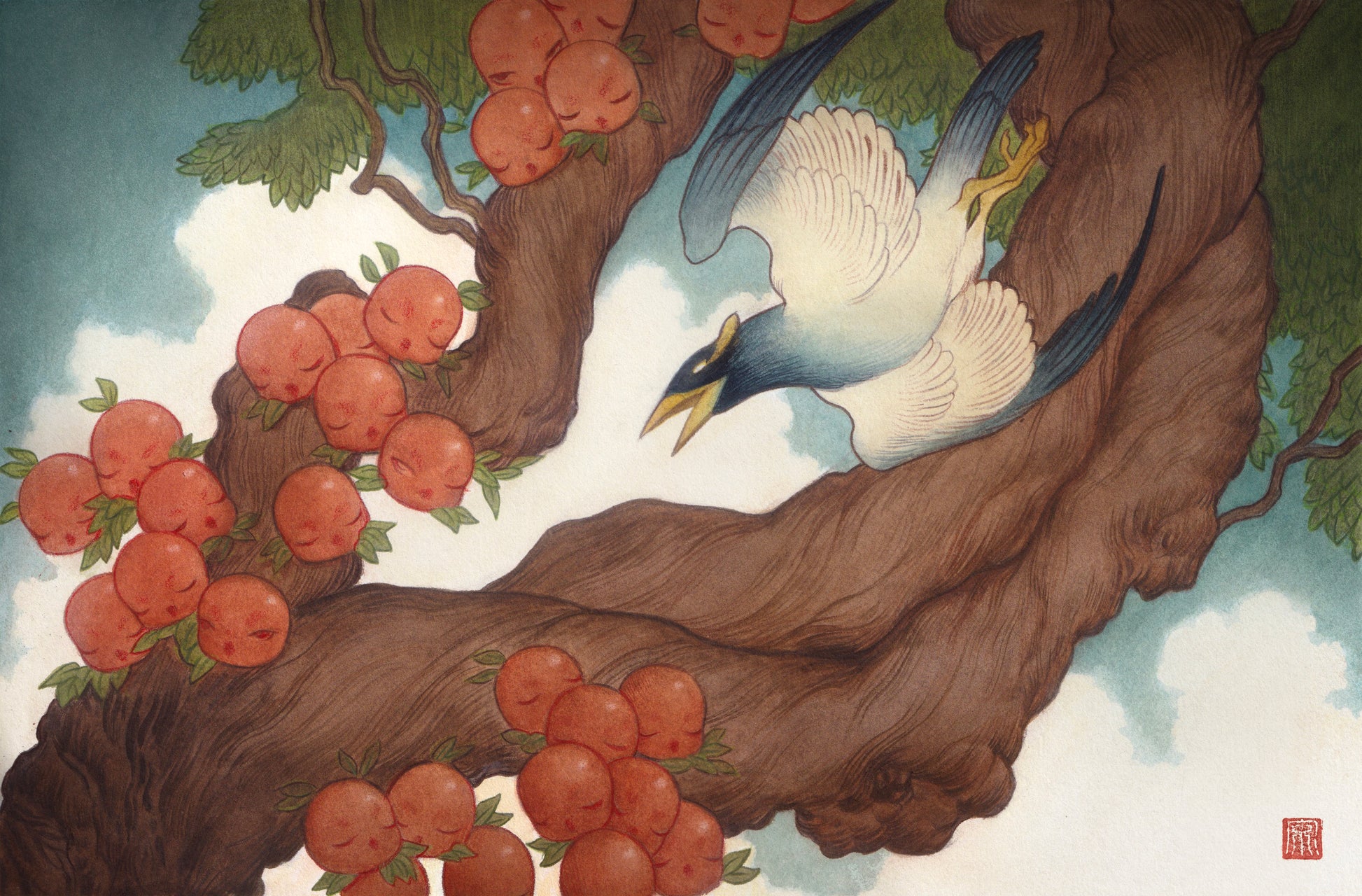 Featured in the book Hokusai: An Artist’s Tribute. Inspired by Katsushika Hokusai’s illustration Myna Bird and Trees.